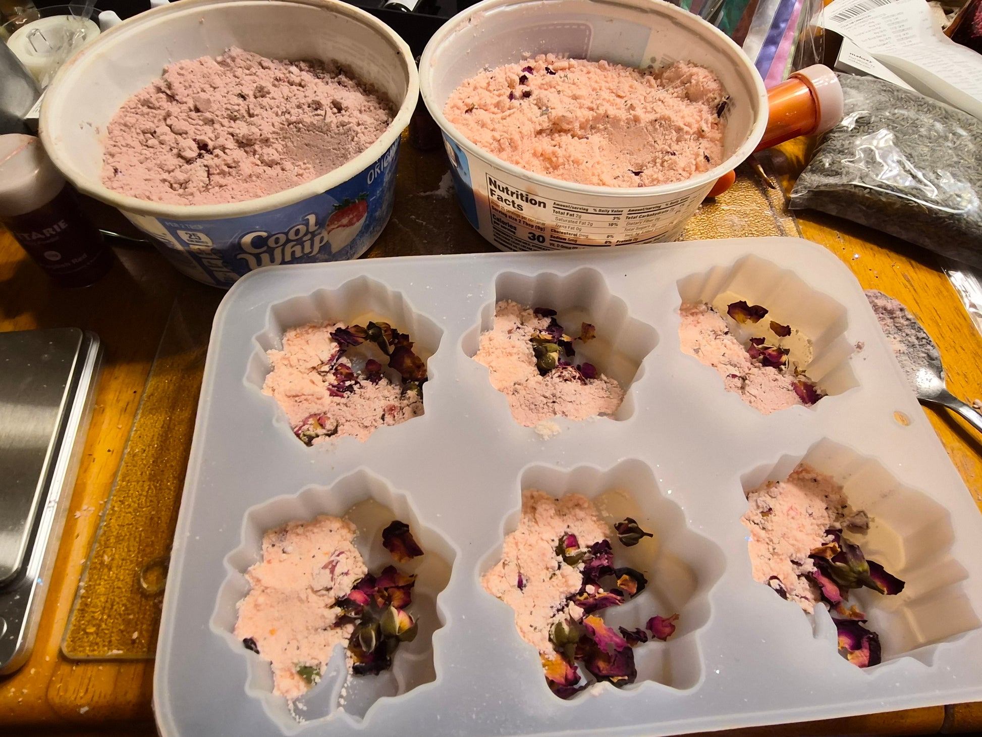 Visual Artistry: The final, exquisite dusting of vibrant Red and shimmering Silver mica highlights the detailed floral pattern on top, creating a captivating sparkle as the bath bomb hits the water.
