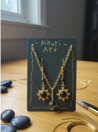 This elegant black and gold set, featuring a starburst design, captures the mesmerizing beauty of a solar eclipse. A single faceted black onyx stone is at the heart of each piece, surrounded by a radiant gold-toned halo. This set makes a striking statement, perfect for an evening out or to add a touch of celestial charm to your everyday look. each earing has two small lava stones. gold plated iron chain necklace.
