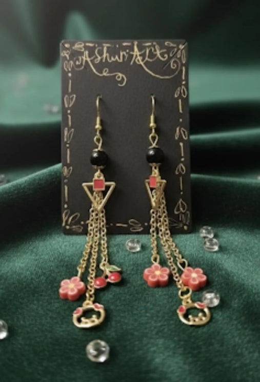 Description: Inspired by playful, whimsical aesthetics, these earrings are designed to delight. A delightful piglet and a cluster of ripe cherries dangle below a charming pink blossom and a sleek triangle. Perfect for adding a pop of color and personality, these earrings are sure to make you smile.