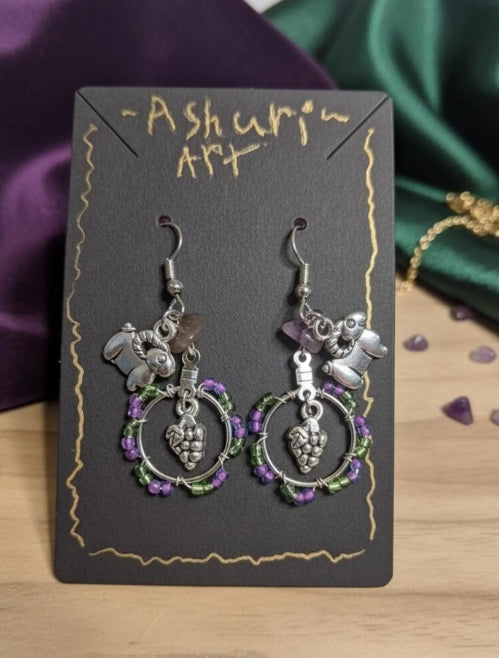 These charming, handcrafted earrings feature a delightful blend of nature and fantasy. Each earring showcases a small, detailed silver-toned ram charm and a genuine amethyst chip bead.