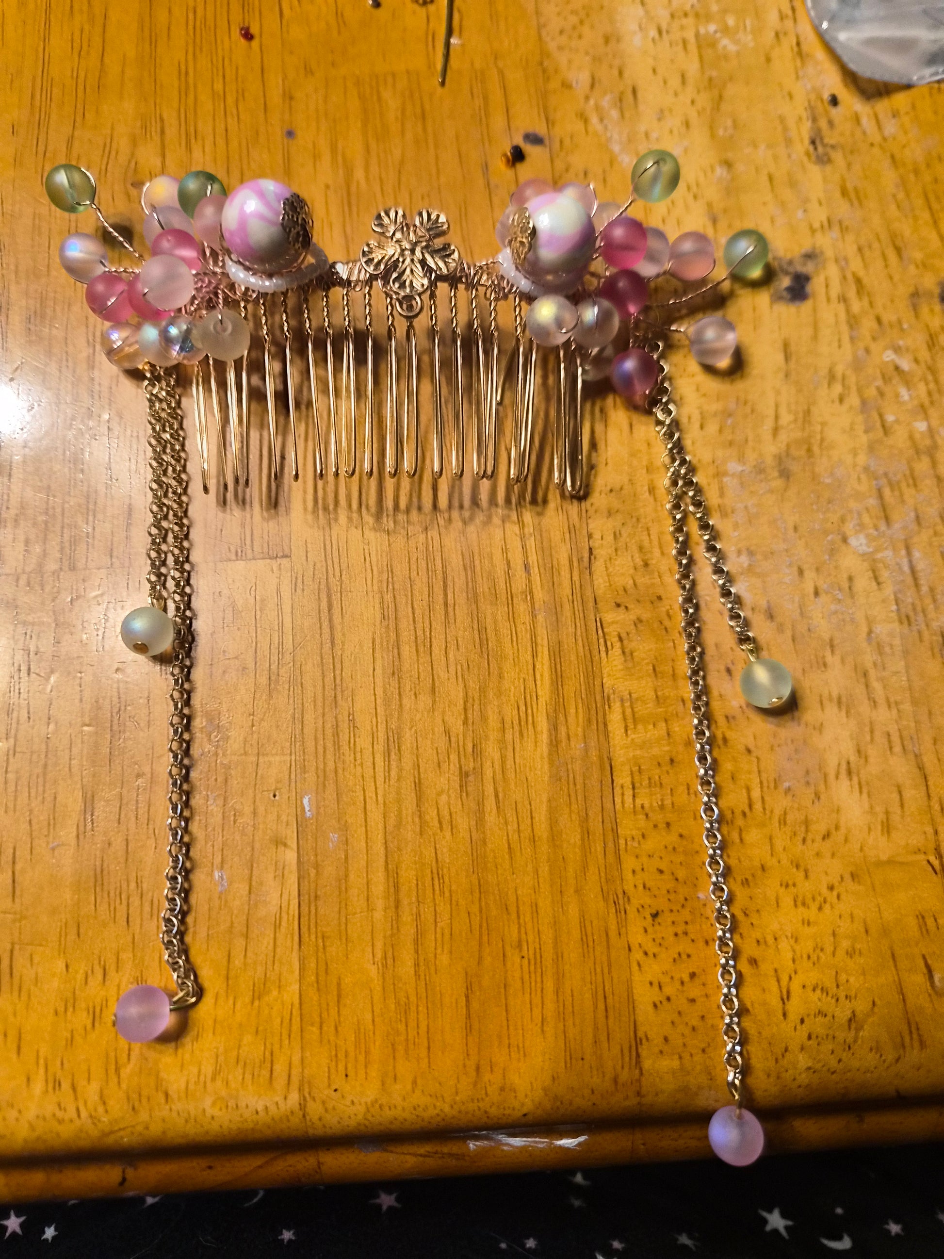 This comb features a delightful cluster of beads in soft, iridescent hues of blush pink, misty lilac, and pale jade green, evoking the serene beauty of a sunrise. Each bead is meticulously wire-wrapped onto a sturdy gold-tone metal comb base.
