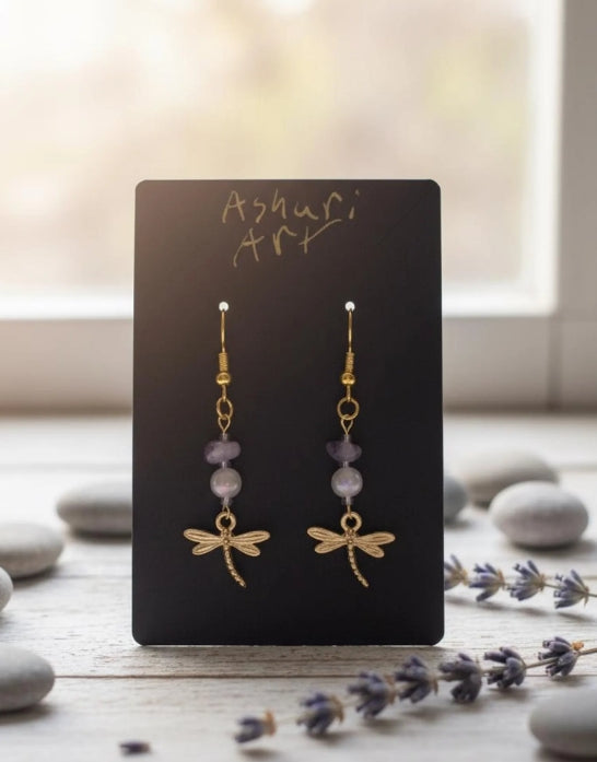 Embrace a touch of whimsical elegance with these beautiful handcrafted dragonfly earrings. Each pair is made with genuine, raw amethyst chips and shimmering glass beads, adding a subtle sparkle to any look. The delicate dragonfly charm and ear hooks are made from durable copper, which is known for its beautiful warm tone and unique character.